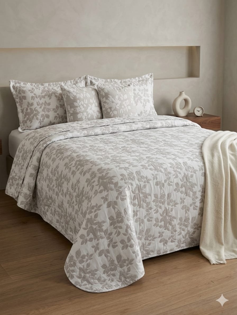 Su delicado diseño de ramas en tono beige aporta un toque natural y elegante que combina fácilmente con diferentes estilos de decoración. Gracias a su acabado matelassé, esta colcha ofrece textura, volumen y una apariencia moderna que realza la estética de cualquier habitación.