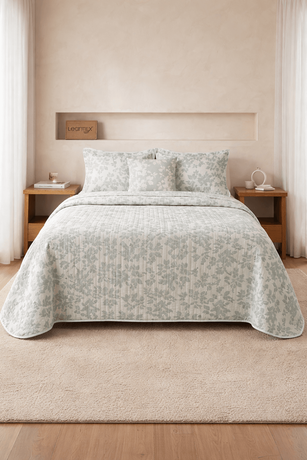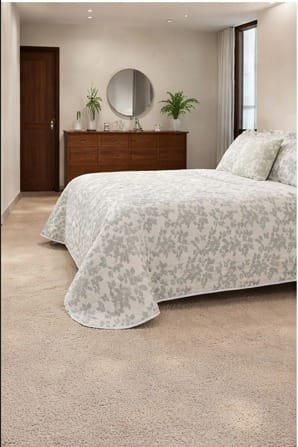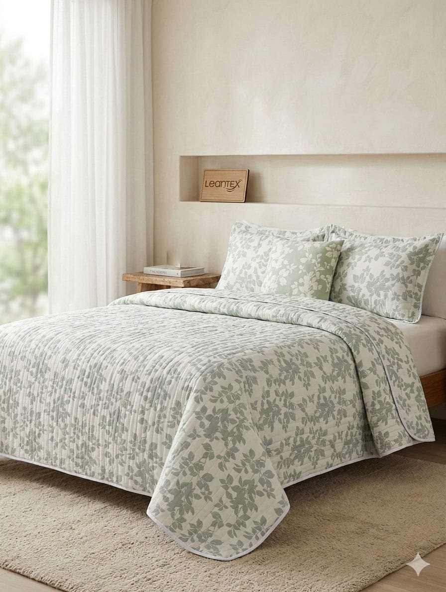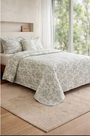 Su delicado diseño de ramas en tono verde aporta un toque natural y elegante que combina fácilmente con diferentes estilos de decoración. Gracias a su acabado matelassé, esta colcha ofrece textura, volumen y una apariencia moderna que realza la estética de cualquier habitación.